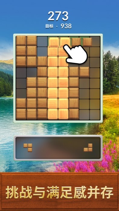 1、核心操作是将木质方块拖拽至拼图面板,通过点击嵌入合适位置,清除横竖线上排列的方块,腾出空白空间。